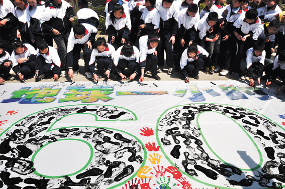 以应对全球气候变化、倡导节能环保为宗旨的“地球一小时”活动3月26日在全国80多个城市同时举行。3月25日,安徽省含山县文明办、团委、供电公司联合举办了以“地球一小时 我们齐参与”为主题的“碳足迹”行为艺术公益活动,倡导低碳环保、节约能源的生活理念。图为安徽含山一中学生在“地球一小时”宣传画布上签名。