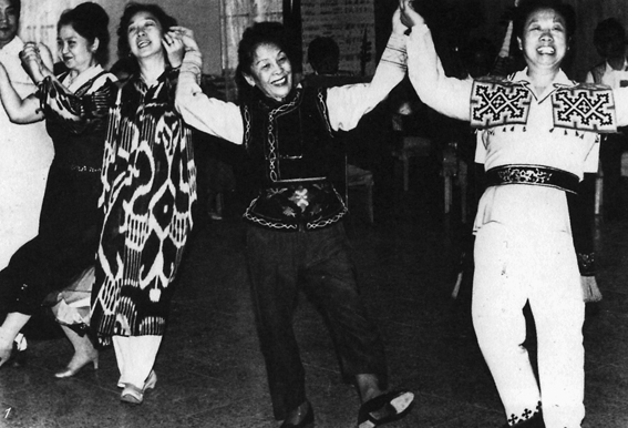 图为戴爱莲在组织民间舞蹈“人人跳”活动。戴爱莲毕生致力于舞蹈艺术的推广,这种“人人跳”舞蹈普及性强,尤其受到戴爱莲的喜爱、重视,戴爱莲去世后,她的众多生前好友在悼念活动现场也跳起了这种舞蹈,以表达对这位前辈艺术家的崇敬。