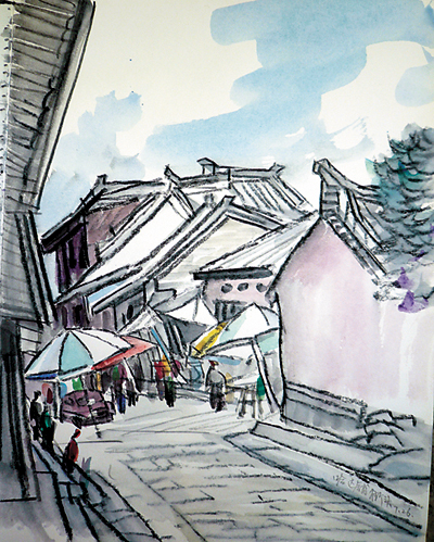 2010年7月下旬,著名画家杨力舟参加了中国文联、中国美协赴革命纪念地甘肃创作采风活动。活动期间,采风团途经被誉为“长征加油站”的宕昌哈达铺,杨力舟现场绘就今朝的哈达铺街景。