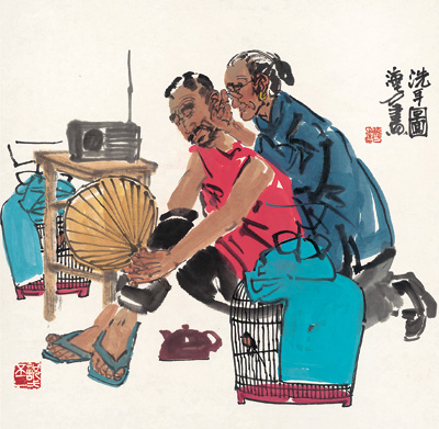 还有一幅风俗图,一个秃头光膀子的“爷”躺在竹椅上,一个修脚工在“雕刻”他的脚指甲。另两个与“爷”同样打扮的人,聚拢在修脚工边,似在“赏玩”技艺吧,让人不自觉地联想到那句俗话:“天桥的把式,光说不练。”但有把式之称,恐怕都有“玩”的境界吧。这幅风俗图有一种漫画似的夸张,描摹的显然不是当下的北京,就像许多所谓京味的小说一样,多是让人返还古老的皇城。