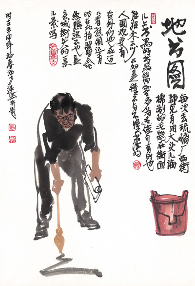 你看他的《找乐图》,四五个老头一起遛鸟,鸟笼子有的放在地上,有的挂在树上,一个老头的肩膀上还站着一只鸟。人物形象也是各具情态,有人侧耳倾听,有人微笑关注,有人欲说又止……更有意思的是马海方的题款:“北京人爱玩儿,玩儿起来还就爱往一起凑,其实这些爷们凑在一起也不为别的,就是为了找乐儿!”
