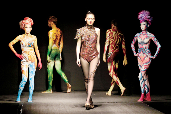 4月19日,大连时装周活动之一的“绚烂”2011新生力造型师彩妆流行趋势发布会在辽宁大连Z28时尚硅谷举行。本次发布会为观众呈现出彩妆最新流行趋势。图为发布会上,模特展示人体彩绘。
