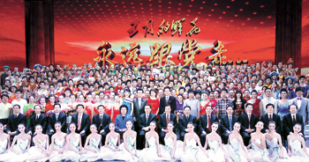 5月4日,全国大学生校园文艺会演《五月的鲜花——永远跟党走》在北京举行。中共中央政治局常委李长春观看演出。这是演出结束后,李长春与大学生合影。
