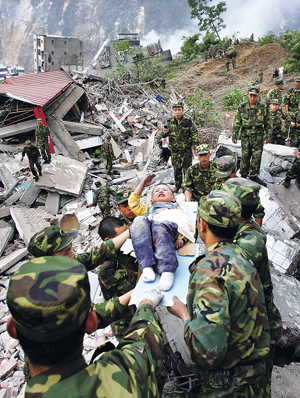 2008年5月13日,靠着同学帮助输液等紧急措施在废墟中扛过了20多个小时的北川中学高一学生廖波被解放军救起。之后,他在绵阳做了左小腿截肢手术。 陈燮/摄