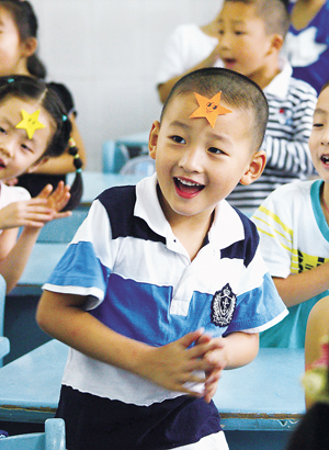 2010年9月1日,恢复健康后的郎铮在小学的课堂上拍手欢唱着。 杨卫华/摄