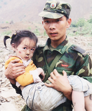2008年5月13日,3岁的郎铮被解放军从北川县曲山镇幼儿园废墟中救出,获救后他向解放军叔叔敬礼,感动了整个中国,被称为“敬礼娃娃” 杨卫华/摄