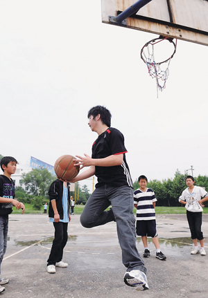 2009年5月5日,截肢后不久便在北京安装了假肢的廖波打起了篮球。 陈燮/摄