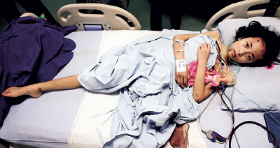 2008年5月13日,5岁的王丹妮被从北川羌族自治县曲山镇幼儿园废墟中救出时,头部、腿部受伤。 杨卫华/摄