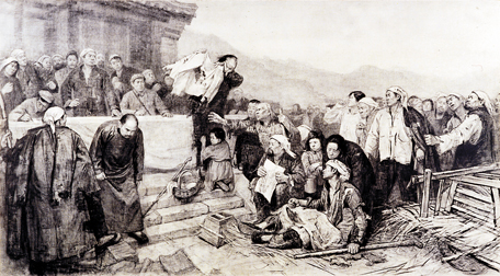 王式廓的伟大在于他始终不渝地坚持现实主义的创作精神,坚守艺术的良知和艺术的人本主义情怀。他创作的《血衣》是新中国美术史最重要的作品之一,占有重要历史地位,它集中体现了王式廓的现实主义艺术思想和创作方法。1959年王式廓为庆祝新中国成立10周年创作出大型素描《血衣》,其素描形式与深刻主题都使之成为美术史上无与伦比的作品。作者为创作该作品,画了大量的速写、素描,多次创作草图,反复推敲构图和人物形象,几易其稿,形成了一个完整的系统,是新中国革命现实主义美术的成功典范。画面的视觉关系充满动感和对比,瞬间情节跌宕起伏,生动刻画了农民在新中国成立初期的历史贡献和丰富的社会变奏曲。《血衣》形成的“深入生活—素材写生—草图研究—画布创作”的创作方式,对新中国的主题性创作和学院教学产生了深远的影响。