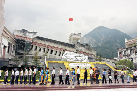 5月12日,四川省阿坝藏族羌族自治州和汶川县各界代表在汶川县映秀镇漩口中学遗址上举行5·12汶川大地震三周年公祭。来自全国各地的群众到四川省汶川县映秀镇地震遗址献花,悼念逝去的亲人。