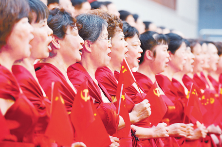 4月19日,群众同唱歌曲《走进新时代》。当日,重庆市渝北区体育馆内,歌声嘹亮,上千名来自社区的群众齐唱《没有共产党就没有新中国》《走进新时代》等红色歌曲,百名钢琴演奏者共同演奏《东方红》《歌唱祖国》,向中国共产党成立90周年献礼。 新华社记者 陈诚/摄
