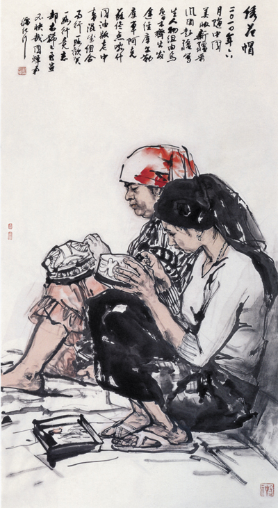 “黄胄和他的学生们”,这个名词里总会包含刘大为、李延声、史国良等人的名字。李延声在展览中回忆说,1980年他刚从中央美院研究生班毕业,就来到黄胄先生身边,筹建中国画研究院;1987年又协助黄胄先生创建炎黄艺术馆。作为学生和助手,李延声在黄胄身边的日子将近20年。李延声还记得黄胄先生总是说,学画是逆水行舟,守是守不住的,一定要“攻”,要到生活中去寻找资源,寻找话题和“攻”的方向。他还要求学生们以笔墨攻关,通过反复写生和练习,集中精力把一个绘画门类、一个物象画精、画深。 |