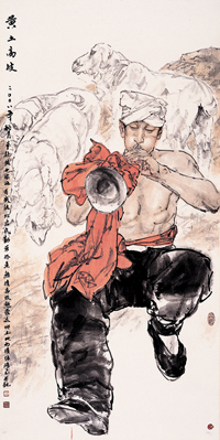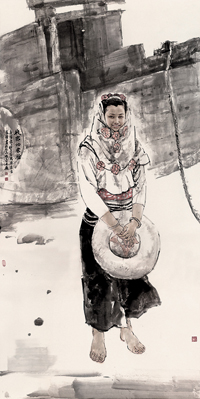 早在一千五百年前,谢赫在“六法”中提出了“气韵生动”这一理念。一个“动”字,体现了中国传统绘画与西方传统绘画的重要区别。众所周知,西方传统绘画以再现一个凝固的时空瞬间为己任,以科学的解剖与表现无限远的焦点透视规则相结合,力图在画面上还原一个真实的物理空间。杰出的现代主义大师如克利·康定斯基在现代主义探索中重视绘画语言的音乐性表现,但他们终究不能不为此而“背叛”他们传统的再现美学,并抛弃了当时东方人赞不绝口的科学解剖与透视。而中国传统绘画虽不写实,但更侧重于心理空间的描绘,强调意象的诗境表达。“气韵生动”之“动”,便有时间的参与,固中国传统绘画是空间与时间结合的四维表现。运动之美的产生在于节奏和韵律,因此,“韵”便是中国绘画语言中特有的诗化因素。“气运,就是宇宙中鼓动万物的‘气’的节奏、和谐。绘画有气韵,就能给欣赏者一种音乐感”(宗白华)。在中国传统绘画中,语言不仅负载着状物叙事的功能,而且通过节律性的表现成就了中国绘画特有的视觉音乐效应。“声乐之入人也深,其化人也速”(荀况)。因为音乐的节奏与韵律最容易引发受众产生异质同构的心理共鸣。“寻声律而定墨”,刘勰的美学思想,是中国传统文化中的表现性原则,几乎涵盖了所有文化门类,包括小贩的沿街叫卖和哭坟。古代的中国人将“乐”放在一个十分重要的位置,与治理社会的“礼”同等重要,古代文人的第一修养,便是琴,这种音乐修养加上他们原本谙熟的诗词文字韵律的功底,使他们最终在中国美术史上创造出最具音乐效应的绘画——文人画。在勾、皴、点、染的技法程式的框架中,以虚实为核心,形成了绘画语言要素的对偶组合格局。如构图的开合,形态的方圆、黑白,执笔的中(锋)偏(锋),运笔的顺(锋)逆(锋),行笔的疾缓,以及墨、色的浓淡、枯润等。这种对偶组合如同诗词中的平仄对偶,是便于实现语言节奏化的处理,使语言进入诗化的重要基础。中国绘画语言(包括划去)的音乐性或曰诗化,是中国绘画美学最鲜明的特征,也应当是当代继承传统的重要内容。当代的人物画经受了写实主义的洗礼,承受着科学造型与透视观念的制约,更多的是依赖西画的构图经验与造型的生动性来进行表现。这样,便使得绘画语言的叙事性排斥了语言的诗化表现。所以张鸿飞的艺术探索对我们应当具有启示性。
