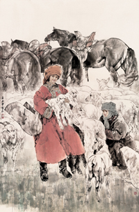 第一次见到张鸿飞的作品《白山黑水》,即给我留下了深刻的印象。这是一幅充满诗意的作品,让人过目难忘。这件反映抗日联军革命历史题材的作品,虽然没有直接描绘战争的残酷场景,看似远离战场,但通过女卫生员身边的枪支、刚洗净的绷带与日寇的钢盔,暗示着博杀就在近前。而娇小的女战士和优美的雪景表现出的恬静之美,与之形成的强烈反差,动人心魄。这件作品呈现出来的美,并不完全属于以上的文学性表述。画面中的语言传递的更多的是不可用文字话语表达的情感韵致。作者通过对绘画语言的处理,使画中的文字性因素实现了升华,比现实更美更真实。张鸿飞在自己的艺术品实践中,探索了从文字性的诗意到视觉语言的诗化这样一个重要的课题。使具有诗意的文学性构思,通过诗化的视觉语言的表现,达到了诗境。