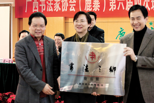 2011年3月中旬,鹿寨县获授“广西书法之乡”。图为广西文联主席、广西书法家协会名誉主席潘琦(左)为鹿寨县授牌。鹿寨县委书记刘芳(中)和县长覃建波接受牌匾。