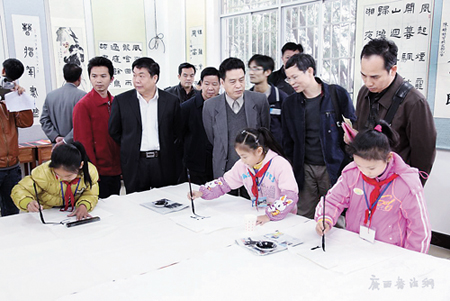 “广西书法之乡”评审团兴致勃勃地观看鹿寨县“兰亭书法学校”的学生创作书法。