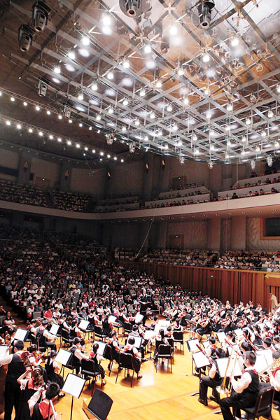 每年6月1日为国家大剧院特设的“青少年主题日”。今年的主题日从早上9:30到下午15:45共有6场公共空间演出,包括4场歌舞形式的童谣表演、1场弦乐四重奏演出和1场歌剧经典咏叹表演,让孩子们在寓教于乐中亲近艺术。当晚,持续半个月的“2011年国家大剧院北京青少年艺术周”暨“北京市第十四届学生艺术节优秀节目展示”也在刘凤德、刘璐执棒,北京市海淀区中关村第二小学、北京市第八中学共同演绎的音乐会中成功闭幕。在现场的“北京市第十四届学生艺术节——艺术之星”颁奖仪式上,共有孙荆京、王良等40位小朋友获得了“艺术之星”称号,10多位广西贫困山区的学生受邀观看了演出。图为“青少年艺术周”闭幕音乐会现场。