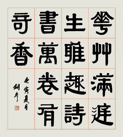 张铜彦从汉魏的碑学中汲取了深厚高古的神韵,并将其发扬光大。他所作的魏碑,起止方整,法度谨严,舒展自如;笔力提按顿挫,清晰分明,取唐楷的淳厚及碑之险绝,处处体现着萧散静雅的韵致。他注重书作中的整体气象,从气格、气度、气韵等角度来综合审视和提升作品的品位。他的魏碑内敛的笔势、含蓄的起止、婉曲的线形、刚毅的内质、稳健的结字,充分完成了他心性的外露。他的隶书作品追求大气、厚重、古朴,结体平稳端庄,用笔凝练含蓄,体现笔墨的顺涩缓疾,以内蕴丰富、韵味醇厚取胜。落笔中锋铺毫,并以篆隶的笔法相互渗透,颇见工巧。他的创作是循序渐进的心理流程体验,凭借他对传统的深厚功力与感悟,一点一滴地融化在传统的体验过程中。孙过庭在《书谱》中曾说:“一划之间,变起伏于峰杪;一点之内,殊衄挫于毫芒。”张铜彦隶书的“点划”都有他自己微妙的处理,在曲折中求得变化,因而其作品从“线性”上看,有一种敦厚的形质。由此可知,张铜彦的隶书不琢磨、不雕饰,如璞玉浑金,显示出大气磅礴、沉雄朴茂的庙堂风格。这种淳朴、平和、敦厚之美,有着丰富的艺术内涵,当然也有着不寻常的高难度,这种重诚实、不伪作的从艺态度决定了他的大将之风,是媚俗邀赏者所难以企及的。