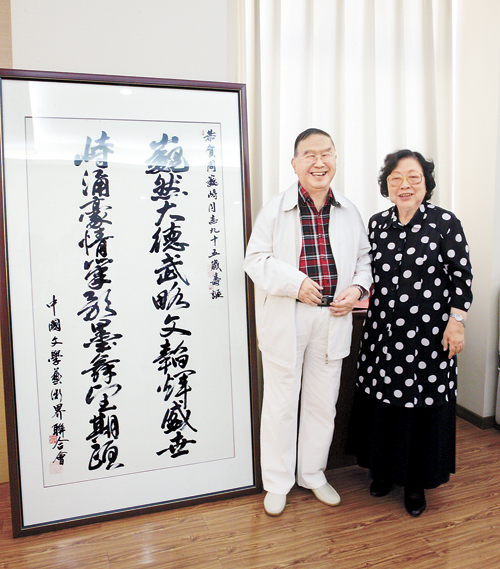 上图:中国文联党组领导赵实(右三)、李屹(左二)、冯远(右二)、廖奔(左一)、夏潮(右一)与周巍峙(左四)、王昆(左三)夫妇合影。下图:周巍峙、王昆夫妇在贺寿楹联前合影。 中国文联网记者 余宁/摄