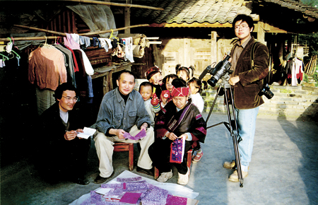 乔晓光(左二)在贵州苗族拍摄民间剪纸申遗片(2003年)