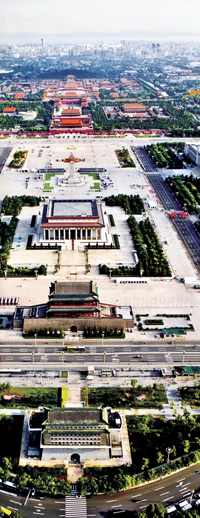 另外,中轴线是北京故都低水平天际线的制高点,在其周围的建筑无论是从空间上还是从高度上,都应考虑到对中轴线的影响。近年来,新的建筑高度仍有突破现象,再加上新的建筑在体量上不注意与旧存建筑保持协调,外观上多用大玻璃墙体,不仅使故宫成了盆景,也使中轴线的宏伟气势被削弱。