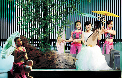 江苏是梅兰芳的家乡,《天女散花》作为其早年文戏武唱的代表作,自然成为梅派青衣李洁首选的曲目,在她清丽圆润的演唱中,长达8丈的彩绸随着婀娜飘逸的舞姿,变换出20多种精妙绝伦、绚丽缤纷的形态,而当家喻户晓的“海岛冰轮”、“家住安源”的京剧选段刚一脱口而出,更是博得了满堂彩,尽显梅派的精髓与神韵。“好!”在台下热烈的掌声和叫好声中,李政成表演的《汉宫惊魂》淋漓尽致地展示了他非常扎实的武功底子,而扬剧选段《十八相送》和扬州清曲《板桥道情》等文戏唱得也颇有情调,“没想到他既能演武生、老生、小生,还能反串花旦”,观众不约而同地赞叹道。张其萍演绎的歌曲《茉莉花盛开的地方》、评弹《永远的江南》,展现了她清新婉约、歌声甜美的演唱特色,由她首唱的京歌《梅兰芳》则通过舞台上呈现的《苏三起解》《贵妃醉酒》《霸王别姬》等众多戏中人物的造型,勾起了人们无限的遐想。一曲古筝协奏《望秦川》,在黄土高原的古朴浑厚中,增添了江南的委婉与灵动,又一曲古筝独奏《丝绸之舞》,采用具有西域风格的定弦并融合了印度西塔尔琴的特点,把人们带到了那弥漫着异域风情的神秘悠远之旅……任洁的演奏,在浓厚中国传统文化的底蕴中,又融入了现代音乐的精髓。随着杨婷婷纤巧柔指上飞扬的豪迈与激情,琵琶独奏《十面埋伏》和琵琶协奏曲《草原英雄小姐妹》那欢快而明朗、舒展而激越的充满张力的表演,感染着现场的每一个人。