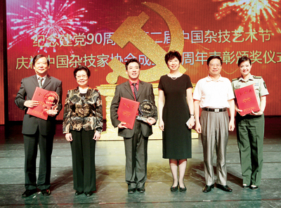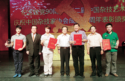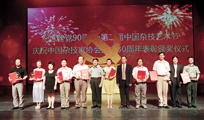 6月18日晚,纪念建党90周年精品杂技节目展演暨颁奖仪式在天桥剧场举行。中国文联党组书记赵实,中国文联副主席、中国文学艺术基金会理事长胡振民,中国文联党组副书记、副主席李屹,中国文联党组成员、副主席冯远,中国文联党组成员、书记处书记夏潮,中国文联荣誉委员李树文、甘英烈、王兆海,中国文联副主席、中国杂协名誉主席夏菊花,中国杂协主席边发吉,中国杂协分党组书记、驻会副主席邵学敏,中国杂协副主席、顾问以及部分全国文艺家协会、中国文联机关部室、直属单位负责人出席了展演前的表彰颁奖仪式,并与首都各界群众一起观看了精彩纷呈的精品杂技节目展演。