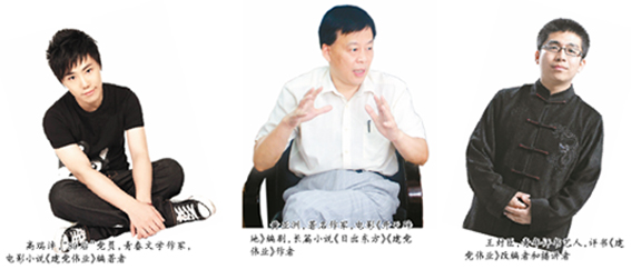 左图:高瑞沣,“80后”党员,青春文学作家,电影小说《建党伟业》编著者 中图:黄亚洲,著名作家,电影《开天辟地》编剧,长篇小说《日出东方》《建党伟业》作者 右图:王封臣,青年评书艺人,评书《建党伟业》改编者和播讲者