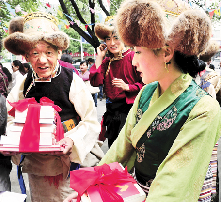 7月12日,庆祝西藏和平解放60周年献礼丛书首发仪式在拉萨市举行。这批丛书是宣传思想文化战线向西藏和平解放60周年献上的一份厚礼,经过精心策划确定了28种重点出版选题,其中《西藏的昨天、今天和明天》《西藏今昔》等图书被中宣部、新闻出版总署列为庆祝建党90周年重点出版物,《安居乐业在高原》《重走解放军进藏路》等10种图书被自治区大庆办列为大庆献礼图书。图为来自拉萨市堆龙德庆县桑木村的次旺罗布(左)和卓玛次仁(右)怀抱获赠图书。