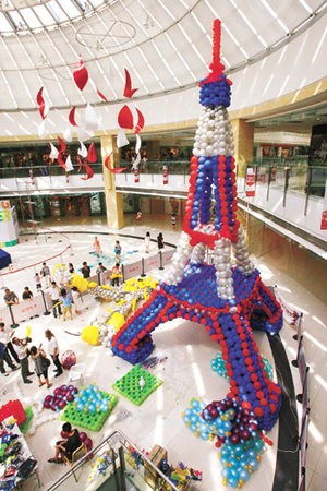 在数十名助手和志愿者的帮助下,两名国际级气球艺术家——荷兰的吉多·费尔赫夫和日本的细贝柳枝耗费数日,用2万余个彩色气球扎制完成12米高的“埃菲尔铁塔”和5个身高4至6米的“变形金刚”气球艺术作品。这些作品7月15日正式与公众见面。图为在浙江省宁波市一家商场拍摄的用气球扎制的“埃菲尔铁塔”。