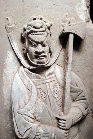 迄今为止,泸县出土、征集石刻武士已有百余块,矮的不到1米,高的逾两米,武士大多为男性,位于墓门左右两侧门柱上,镇守墓室。专家根据造型,将其分为戴兜鍪、戴冠、戴幞头3种类型,又以戴兜鍪最为常见,这也是宋朝典型的武士形象。值得一提的是,《水浒》虽是北宋故事,北宋、南宋的军队建制、武将装备其实并无太大区别,也就是说,这些栩栩如生的武士,某种程度而言就是梁山好汉的再现,如同一部雕刻在石头上的《水浒》。