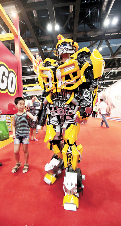 7月29日,北京国际玩具动漫教育文化博览会上,小朋友在看工作人员扮成的变形金刚模型。当日,为期4天的第二届中国(北京)国际玩具动漫教育文化博览会在北京国家会议中心开幕。
