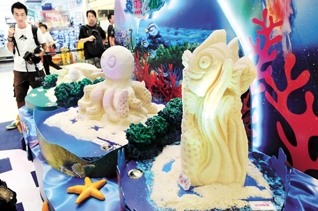 八月三日起至八月三十一日,香港将军澳中心举办以“盐”为主题的“夏日炎‘盐’之旅”。在炎炎夏日里,市民和游客可游览集趣味性、知识性及艺术性为一体的盐学馆、盐艺馆、盐雕工作坊等以“盐”为主题的乐园,了解盐的开采、交易历史,以及盐在美容保健、家居生活中的妙用。这是八月三日拍摄的盐雕艺术品“海底世界”。