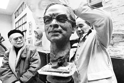 关山月画过无数的模特儿,这会儿却轮到自己做雕塑家潘鹤的“模特”了。