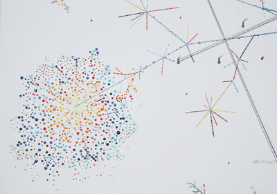 此次展览中,朴载林在“钻石记忆·结构3057”系列装置作品里将宇宙作为艺术表现对象,并使用钻石、五彩渐变的细线等物品架构其上,把画面组合为富有秩序感的几何图像,使作品获得高度的整体性和广阔深邃的宇宙感。此外,朴载林在作品上签署的时间为“3057”,这属于未来的时间也颇耐人寻味。