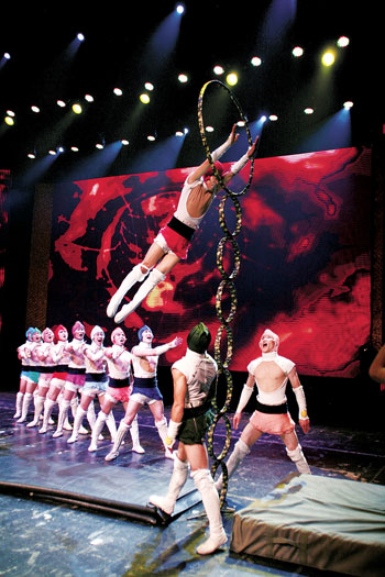 晚会的压轴节目杂技《圣斗·地圈》在技术难度上达到了世界最高水平,深度挖掘了以往地圈节目的本体特色,展现出一种新型的舞台语汇——不仅融入了卡通形象,还借力不停运动变化中的新道具,在技巧方面强调“新度、难度、速度、高度”,直至最后直体穿越高达3米多的八圈,使得过圈的成败更系于毫厘瞬息之间,给整个节目赋予了动态美感,堪称技巧、道具完美结合的成功典范,是一个非常完整的杂技艺术精品。整个节目在体现中国战士勇猛顽强、敢于超越自我的同时,也展示出了一种技巧上的进步和创新。据主持人介绍,演员最后飞越的第八圈的高度达3.8米,打破了吉尼斯世界纪录,全场观众向演员致以了最热烈的掌声。