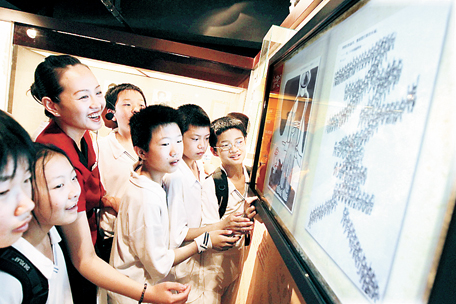讲解员正在为学生讲解著名抗战漫画家陶今也的作品《用我们的血肉,做成我们新的长城》