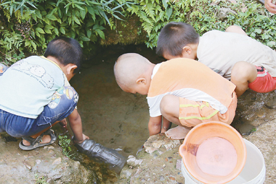 贵州施秉县杨柳塘镇铜鼓村民组的几个小孩用各种瓶子在小井里装水饮用。新华社发