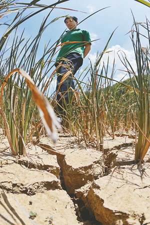 广西隆林各族自治县者保乡中棒村,一位村民走过干裂的稻田。新华社记者 周 华 摄