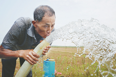 江西新建县厚田乡厚田村农民夏水喜在饮用从农田抗旱机井抽取的水。新华社记者 周 科 摄