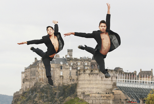 八月十八日,来自摇滚芭蕾舞蹈团的演员埃里克夏·杰罗尼莫(左)和李·甘博斯在英国爱丁堡边缘艺术节的一场媒体见面会上表演。爱丁堡边缘艺术节是爱丁堡艺术节的一部分。除边缘艺术节外,爱丁堡艺术节还包括国际艺术节、军乐节、国际图书节、国际电影节、国际爵士乐节和多元文化节等十几个独立的节日。