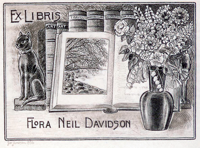 戴维森女士是位忠实的书迷。票面中一本敞开的书,或是戴维森旅行日记中的一册,左面的照片与右边的感言,是票主特有的细腻、浪漫情感的体现。一瓶鲜花遮掩后面的文字,暗示偷看者:此书虽翻开,但因是私人日记,请尊重他人隐私。日记左边的猫像是一个为主人看管书籍的卫士。戴维森女士的名字是拉丁语“Flora”,即是希腊神话中的“花神”,画家詹姆森深得其意,为书票主人送上了一瓶鲜花。日记后面的几本书上刻有书名:艺术、旅行、苏格兰部族、自传、藏书票。这诠释了票主平日里的爱好。