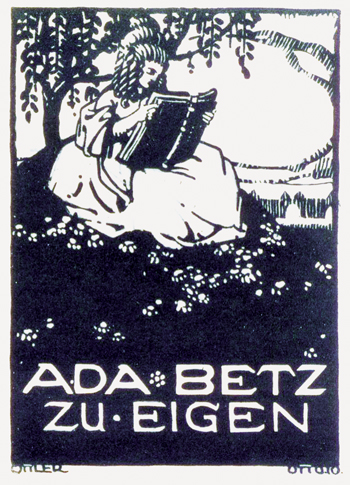 女性票主的藏书票在20世纪初不多见,更遑论女子读书题材的书票。此票制作于1925年,那时,读书是很多女性的梦想,甚至是“时尚”的标签。随着伍尔夫等女性作家在文坛上崭露头角,女性在精神方面的诉求愈发强烈,她们尝试通过求知、读书来逐渐改变长期的弱势地位。那个新时期,读书与化妆等同,后者美化女性外表,前者是女性气质、修养的升华。花开花落,再绚丽的花也会凋谢,女人若想永葆青春,无疑需要书卷洗礼。可叹现今,实用主义、金钱至上等浮华理念比比皆是。读书早已被其他诱惑代替。