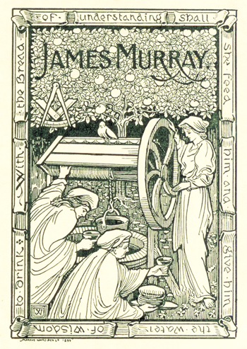《牛津英语辞典》简称“OED”,首创主编是苏格兰语言学家詹姆斯·穆雷,故“OED”有时也被称为“穆雷辞典”。此票就是穆雷生前的自用藏书票。票面中妇人摇着辘轳将清泉从井下捞出。两位智者一人在左,一人在右,手持杯钵准备畅饮。小鸟坐于辘轳之上,一旁的果树注有票主名氏。书票四周围绕的绸饰上的英文“With the bread of understanding,shall she feed him and give him the water of wisdom to drink”,取自《圣经》,意思是:要用生命和明智的食物养育他,用有益的智慧之水。 |