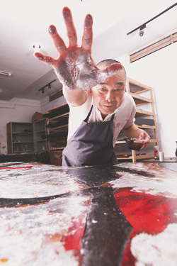 日前,“漆·器·气——汪天亮大漆艺术展”在上海美术馆举办。图为艺术家汪天亮为筹备本次展览在工作室疯狂忙碌的场景。
