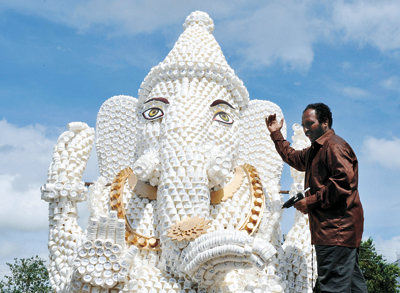 8月29日,在印度的海德拉巴,印度艺术家苏利耶·普拉卡什为参加将于9月1日开始的加内什节的神像作最后的装饰。图为普拉卡什用30000个纸杯制造的高17英尺(约5.1816米)的神像。