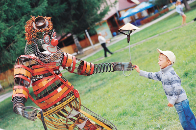8月29日,在俄罗斯叶卡捷琳堡市中央公园举行的第三届叶卡捷琳堡国际“洛姆”(“洛姆”在俄语中意指废金属)雕塑艺术节上,小朋友与雕塑“亲密接触”。