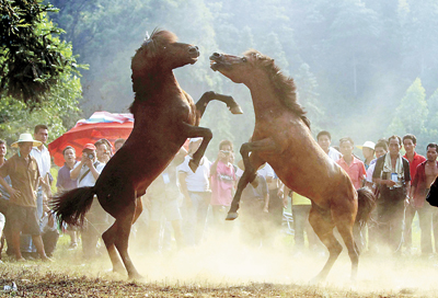 9月13日,在广西融水香粉乡古龙坡,激烈的斗马比赛吸引了观众的目光。当日,广西融水苗族自治县群众欢度传统节日“古龙坡会”,举行斗马比赛庆丰收。据了解,当地的“古龙坡会”分别在每年农历正月十六和八月十六举行,前者祈丰收,后者庆丰收。 新华社发 龙涛 摄