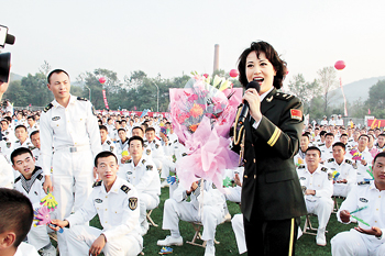 于兰走到战士中间演唱京剧《杜鹃山》选段《家住安源》