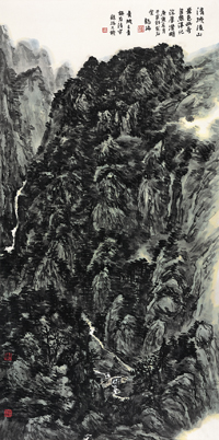试图从对黄宾虹的追摹中增强当代中国画笔意墨蕴的龙瑞山水,当然不是以求“变”体现他的艺术追求,而是在“不变”之中获得中国画的艺术精神与文化品质。他从黄宾虹山水画中获得的最大启示是如何将西学的“线”与“面”转化为中学的“笔”与“墨”,又将传统的“笔”与“墨”溶铸在一起而达到难以剥离拆分的骨肉密合、血肉相融。在他的山水作品中,模糊了以“线”作“骨”、以“墨”作“肉”的功能分层,而完全以“用笔”解决山石茂林的团块形象的呈现。在笔墨之中,又以枯笔浓墨和湿笔淡墨的交错混融追求画面内的笔墨关系,由此形成既苍茫浑朴又润泽华滋的笔墨境界。他并不像黄宾虹晚年那样陶醉于“宿墨”与“焦墨”的胶着与疏离,以此体现苦拙苍辣、天荒地老的境界,而是在“湿”与“枯”的纷披之中显现浓重之内的透脱、苍茫之里的秀润,以此呈现郁然深秀、浑朴厚拙的笔墨意味。相较于黄宾虹,龙瑞的画面尺幅较大,虽然他在一定程度上放大了笔墨的密度,强化了整体的结构,但总体上仍以笔墨的相互裹含、相互交错铺陈形态,特别是那些超宽巨幅的山水,仍以画面整体的气势、灵动流畅的气韵和沉静散淡的用笔而营构天地,充盈其间。这是和黄宾虹山水不尽相同的自家面目,也是龙瑞作为当代画家在承传宾虹老笔墨山水时必然显示出来的某种时代个性。